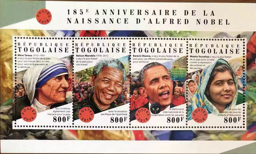 多哥2018年诺贝尔诞辰185周年与诺贝尔奖获得共者(曼德拉'奥巴马'到戈莱兹'马拉拉)邮票小全张