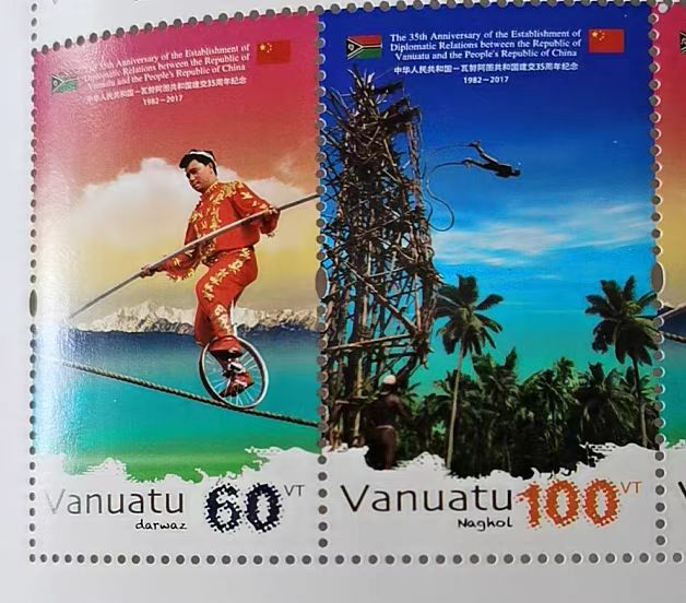 瓦努阿图2017年中瓦建交35周年发行邮票2全,中国新疆‘达瓦孜’和瓦努阿图‘Naghol’(蹦极)
