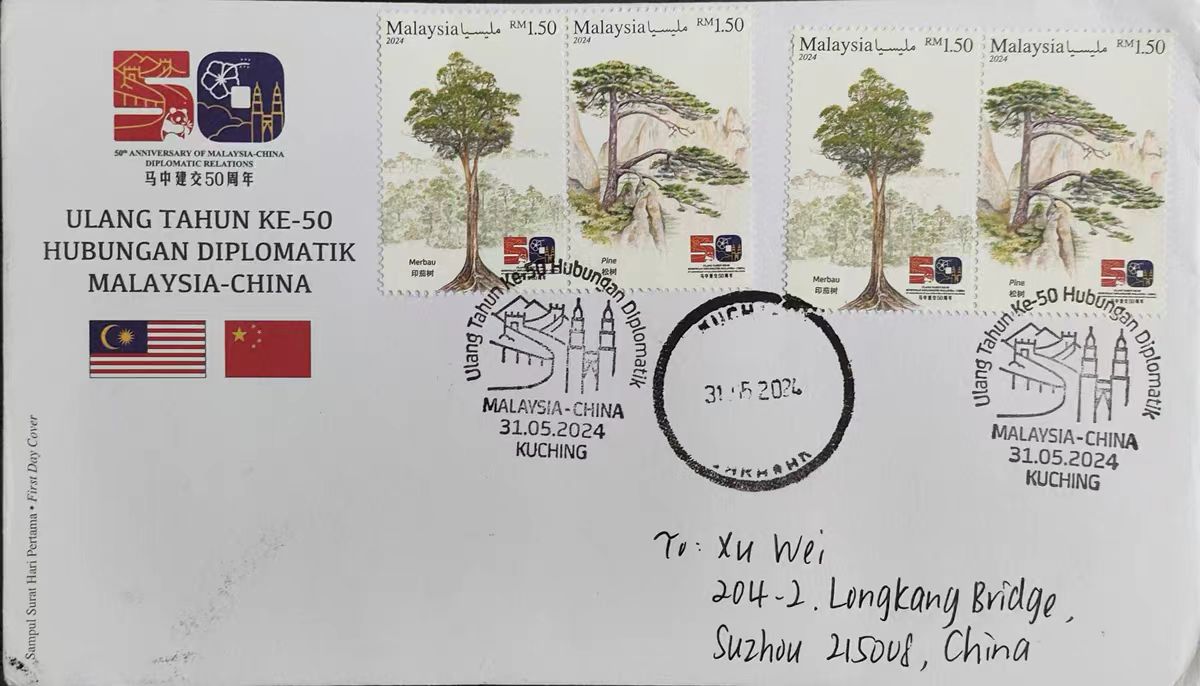 马来西亚2024年与中国联合发行邮票2全首日实寄封(贴2套票)中国黄山迎客松和马來西亚国树印加树