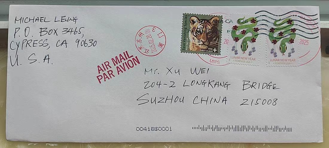 美国2025年生肖蛇邮票1全(贴2套票)实寄封