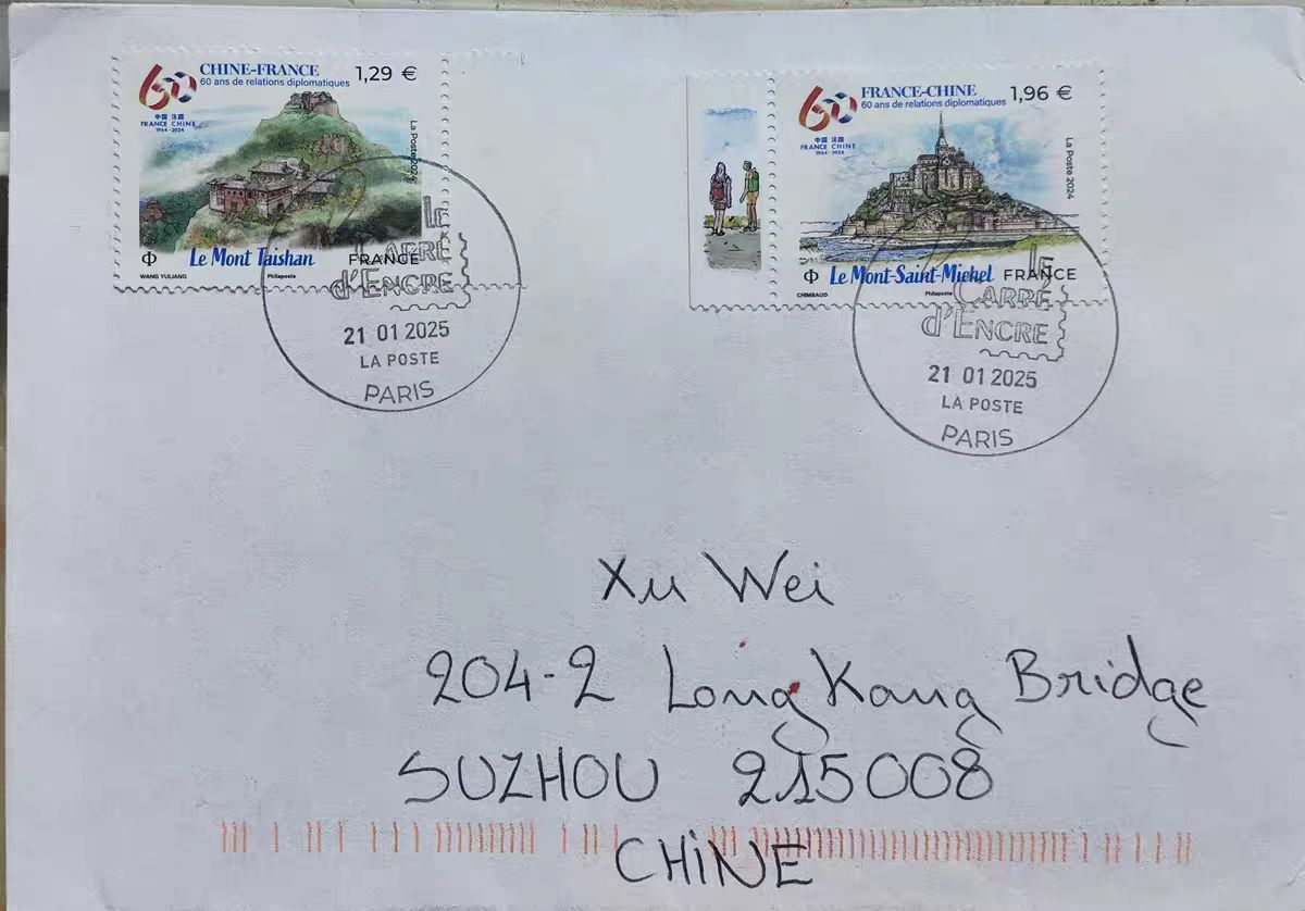 法国2024年与中国联合发行邮票2全实寄封中国泰山和法国圣米歇尔山