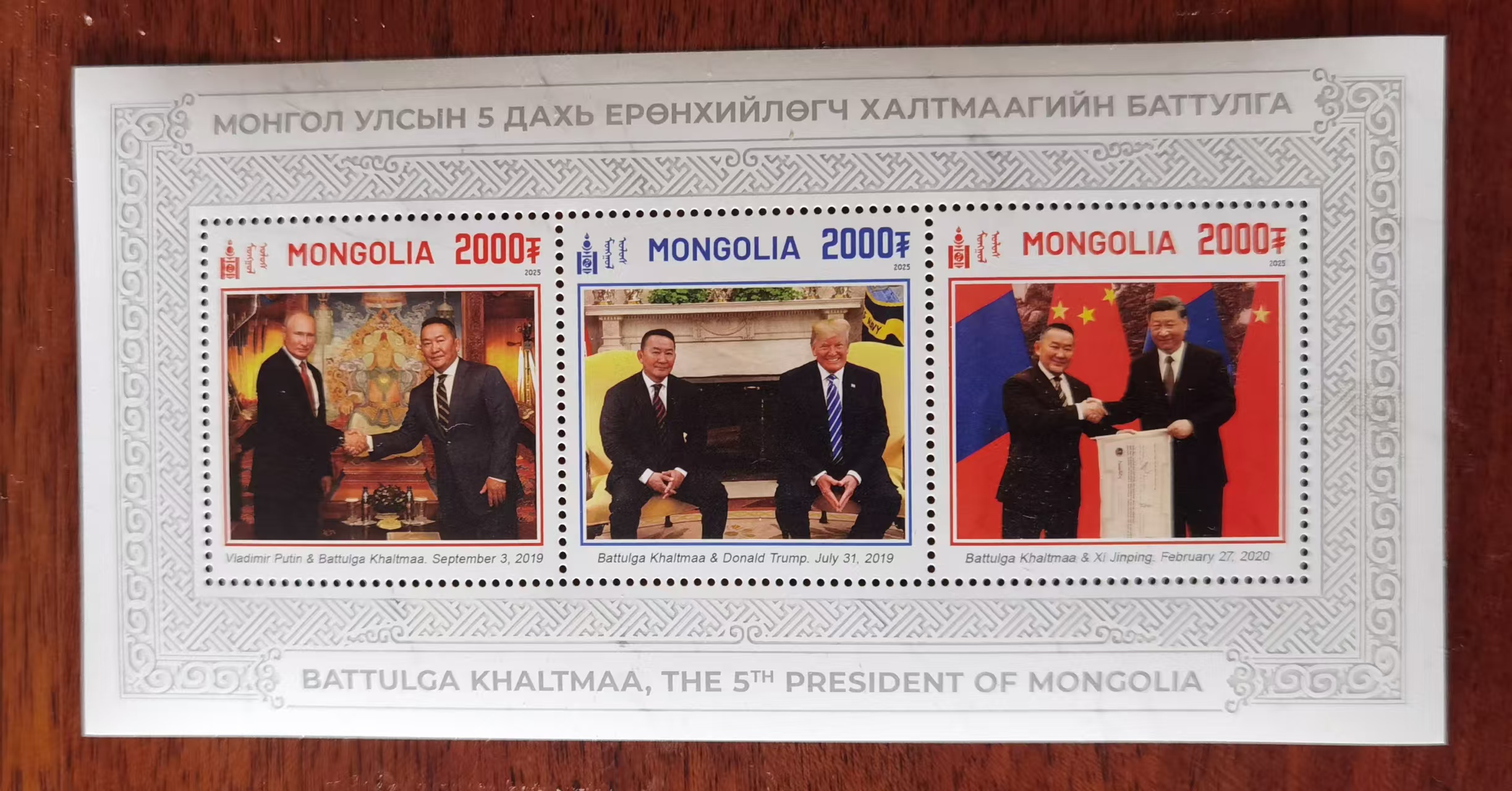 蒙古2025年发行蒙古第五任总统巴特图勒嘎分别与中国国家主席习近平俄罗斯总统普京美国总统特朗普会面小全张